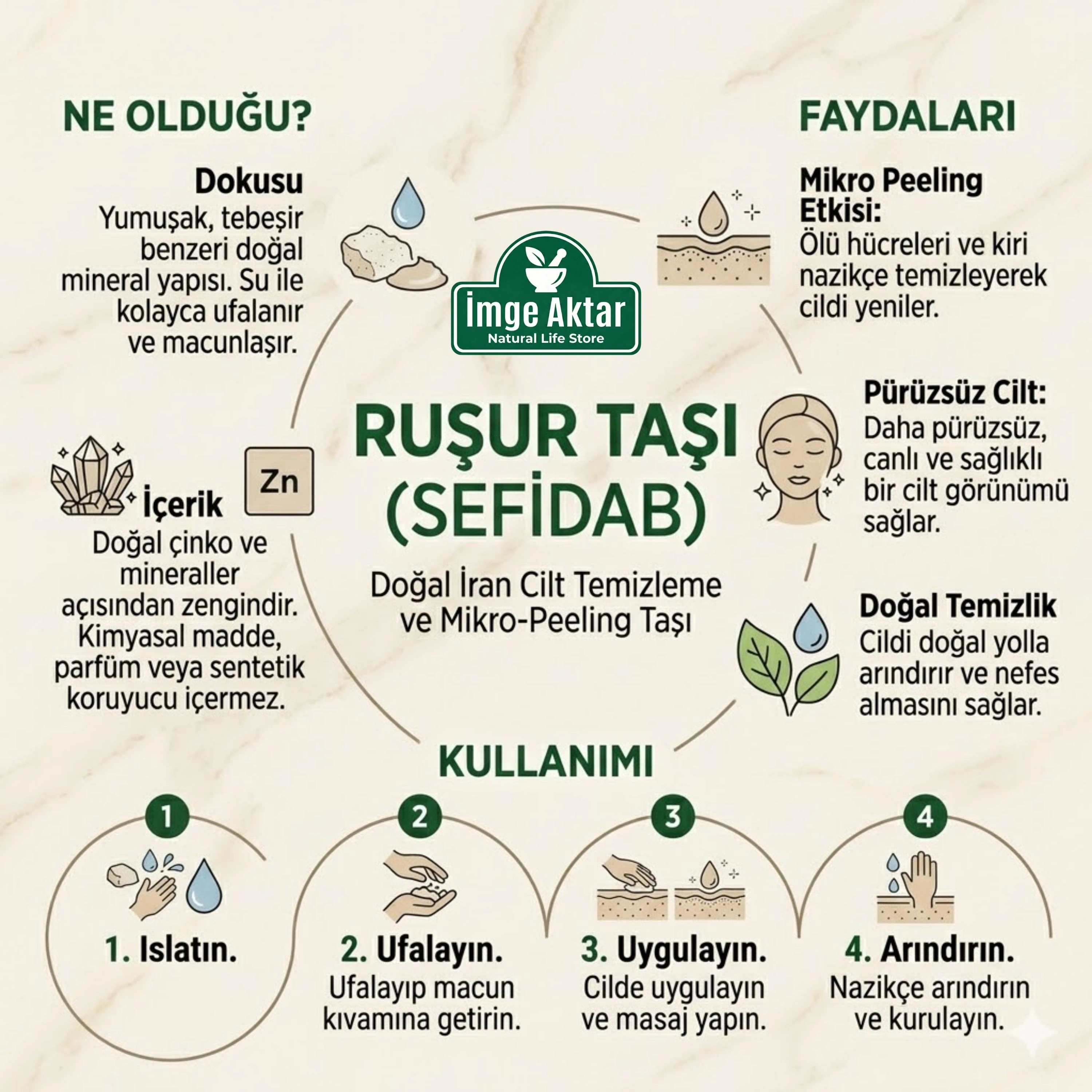 İmge Aktar, asırlardır geleneksel hamam kültürünün ve doğal cilt bakımının vazgeçilmez bir parçası olan orijinal mühürlü Ruşur Taşını (Sefidab) 12 adetlik avantajlı paketiyle sizlerle buluşturuyor. Özel yapısı sayesinde suyla temas ettiğinde yumuşayan bu geleneksel taş, cildi çizmeden ve yıpratmadan derinlemesine temizlemeye yardımcı olur.