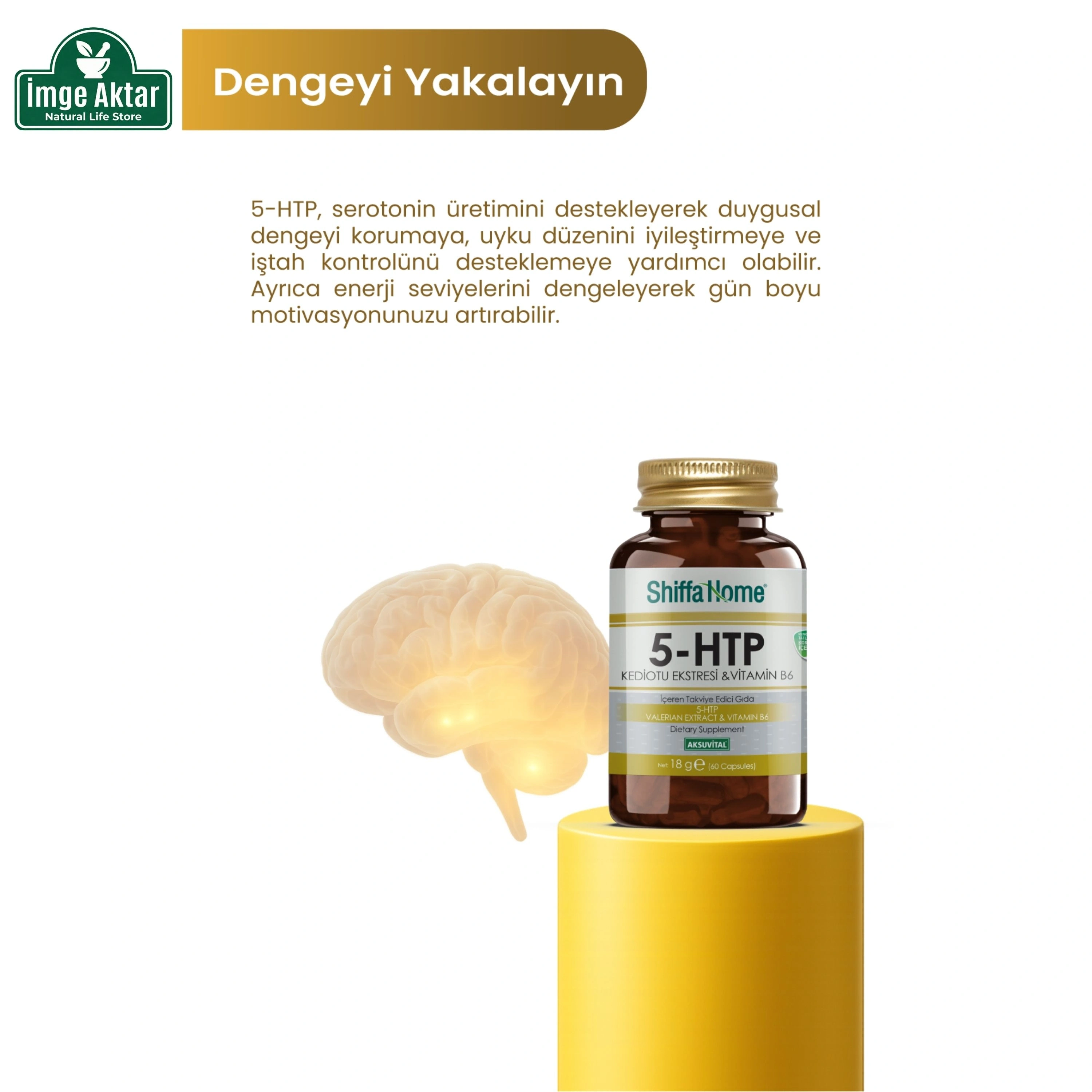 Shiffa Home 5-HTP & Kediotu & B6 Vitamini, vücudun duygusal dengesini ve doğal ritmini desteklemek amacıyla birbiriyle sinerjik çalışan üç güçlü bileşeni tek kapsülde sunar. Formülün ana maddesi olan 5-HTP (5-Hidroksitriptofan),beyindeki sinir hücreleri arasındaki iletişimi sağlayan ve "mutluluk hormonu" olarak bilinen Serotonin'in doğal öncüsüdür. Bu maddeye, eski Yunan'dan günümüze rahatlatıcı etkileriyle bilinen ve Doğu Anadolu florasında da yetişen Kediotu (Valeriana officinalis) kökü eşlik eder. Formülün etkinliğini artırmak için eklenen B6 vitamini (Piridoksin) ise bu bileşenlerin vücutta işlenmesine katkıda bulunur. Günlük stres faktörlerine karşı daha dingin bir yapı oluşturmak, uyku öncesi rutini desteklemek ve iştah kontrolü gibi genel yaşam kalitesi süreçlerine yardımcı olmak isteyen yetişkinler için ideal bir bitkisel destektir.