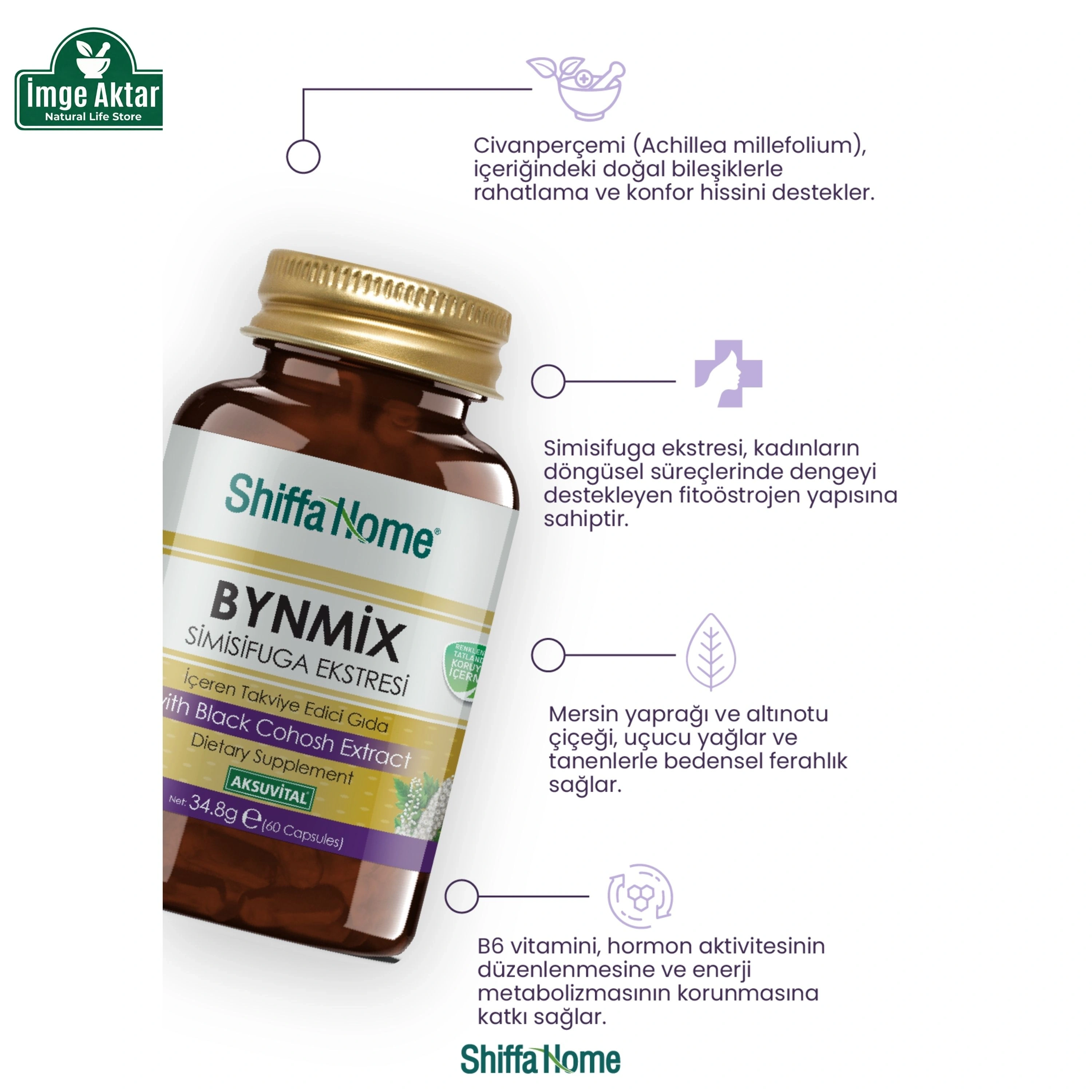 Shiffa Home Bynmix, yüzyıllardır kadınların "bitkisel sırları" olarak bilinen ve geleneksel yöntemlerde sıkça başvurulan özel bitkilerin bir araya getirildiği kapsamlı bir gıda takviyesidir. Formülün temelini oluşturan Civanperçemi, Hayıt Tohumu ve Aslanpençesi; kadınların değişen biyolojik döngülerinde, mevsim geçişlerinde veya ayın hassas günlerinde beden ritmini desteklemek amacıyla tercih edilir. Bu güçlü üçlüye eklenen Mayıs Papatyası ve Adaçayı ekstraktları, karışımın rahatlatıcı etkisini artırmayı hedefler. Bitki çayı hazırlamaya vakti olmayan veya bitkilerin kendine has tadını sevmeyenler için kapsül formu büyük bir kullanım kolaylığı sunar. Günlük yaşam kalitesini korumak ve kadınlara özgü dönemlerde doğal bir destek almak isteyenler için ideal bir yardımcıdır.