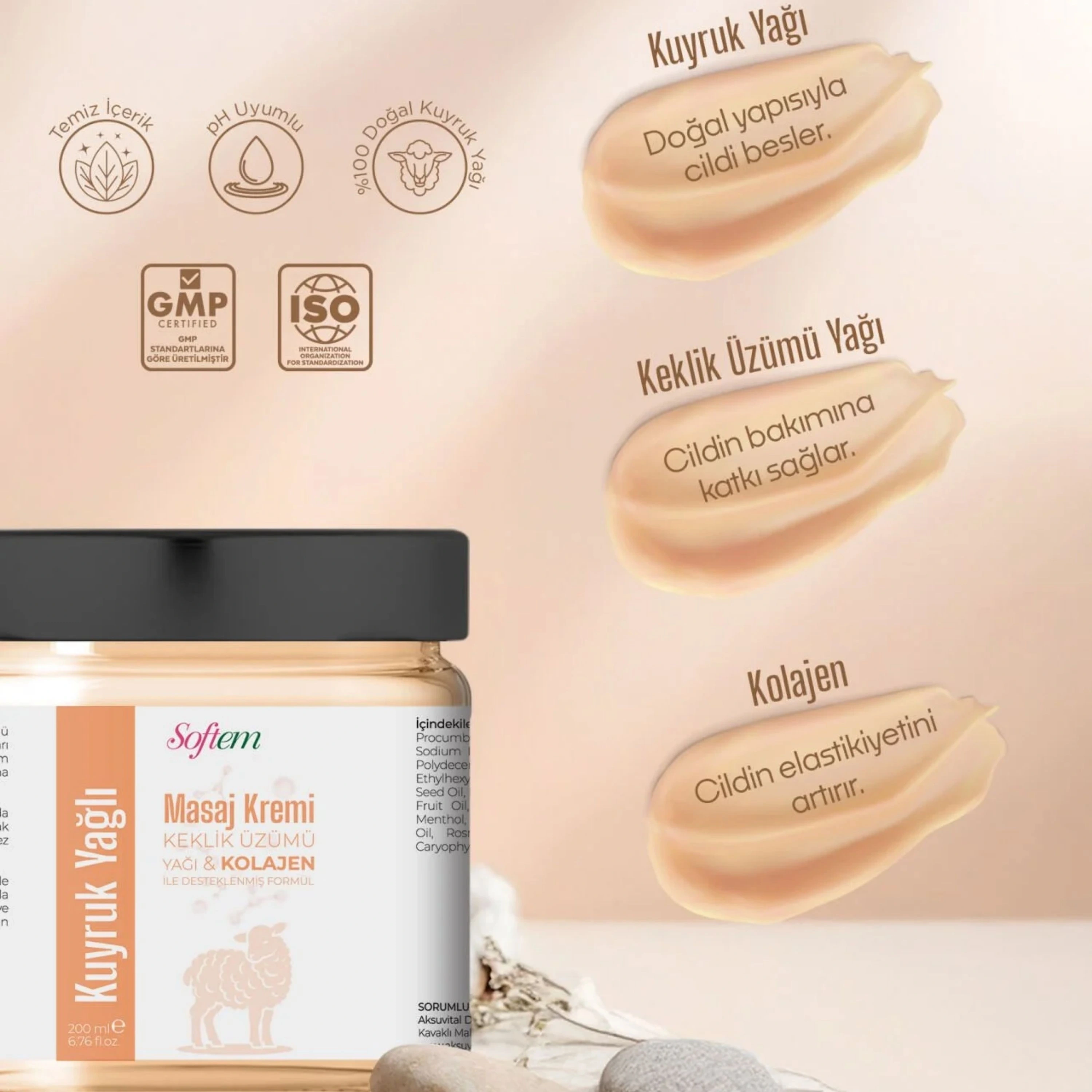 Softem'in yenilenen formülü, Anadolu'nun geleneksel mirası Kuyruk Yağı'nı modern kozmetik bileşenlerle bir araya getiriyor. Bu özel krem; cildi yumuşatma özelliğiyle bilinen **Kuyruk Yağı**'nın yanı sıra, masaj uygulamalarının vazgeçilmezi **Keklik Üzümü Yağı (Wintergreen)** ve cildin elastikiyetini destekleyen **Kolajen** ile zenginleştirilmiştir. İçeriğindeki Nane, Biberiye, Kekik ve Karanfil yağları sayesinde cildinizde ferahlatıcı bir etki bırakırken, pürüzsüz bir doku hissi sağlar. Günlük yorgunluğun ardından vücudu dinlendirmek ve cilde bakım yapmak için ideal bir masaj kremidir.