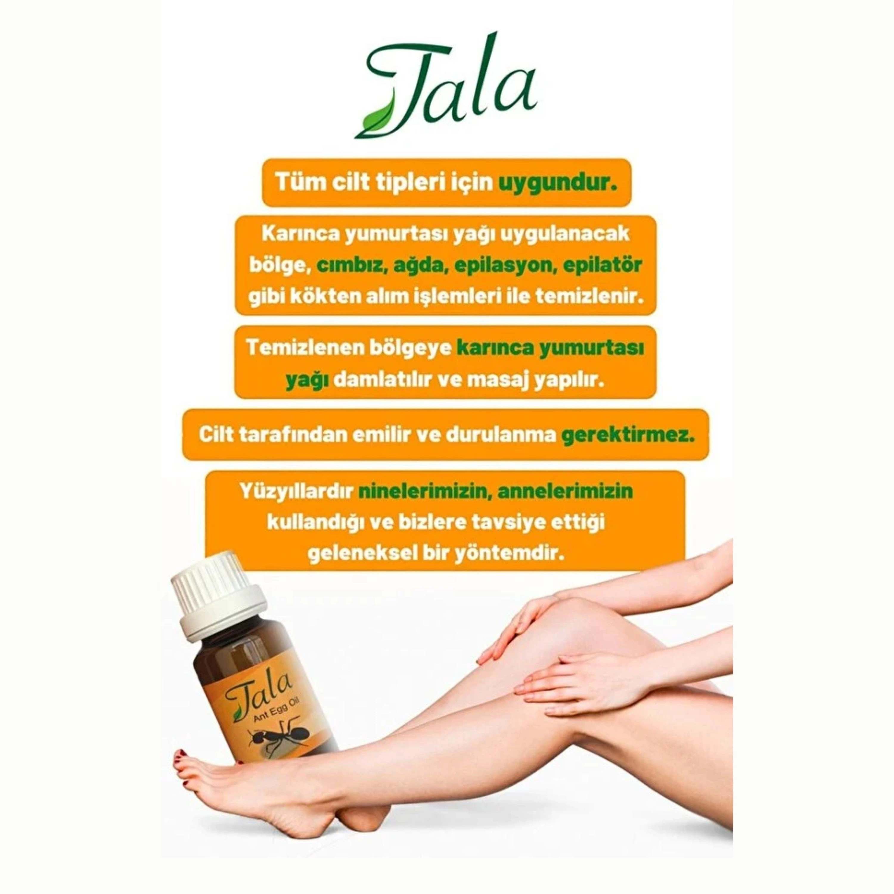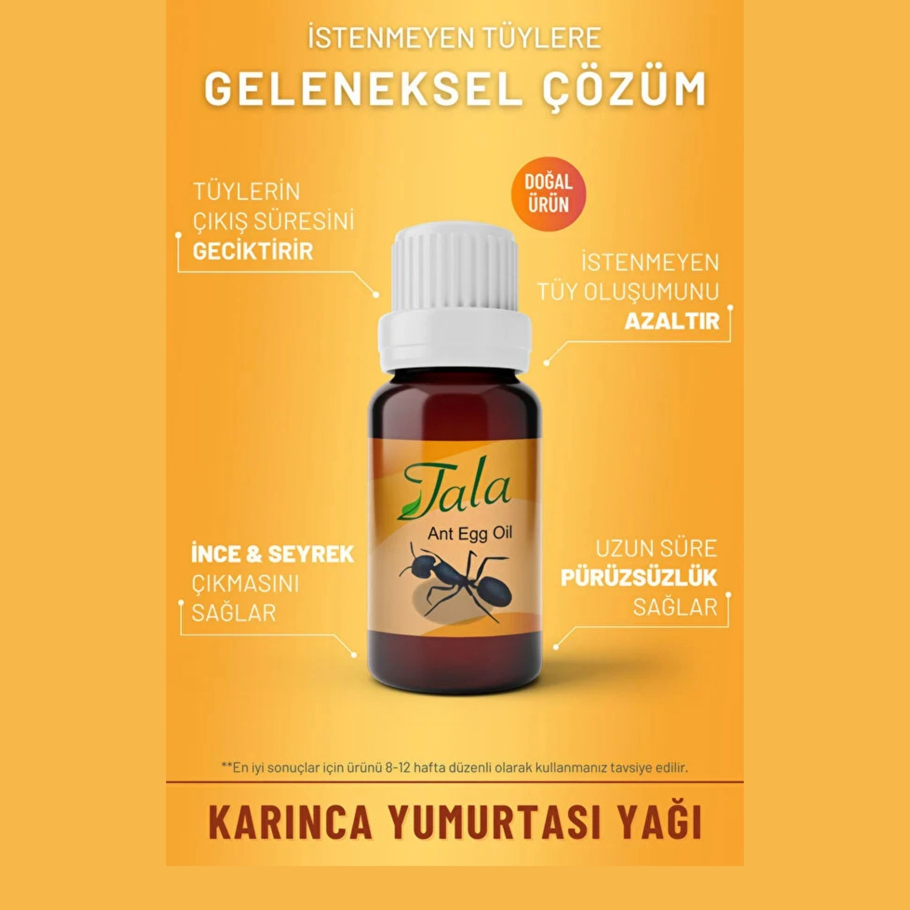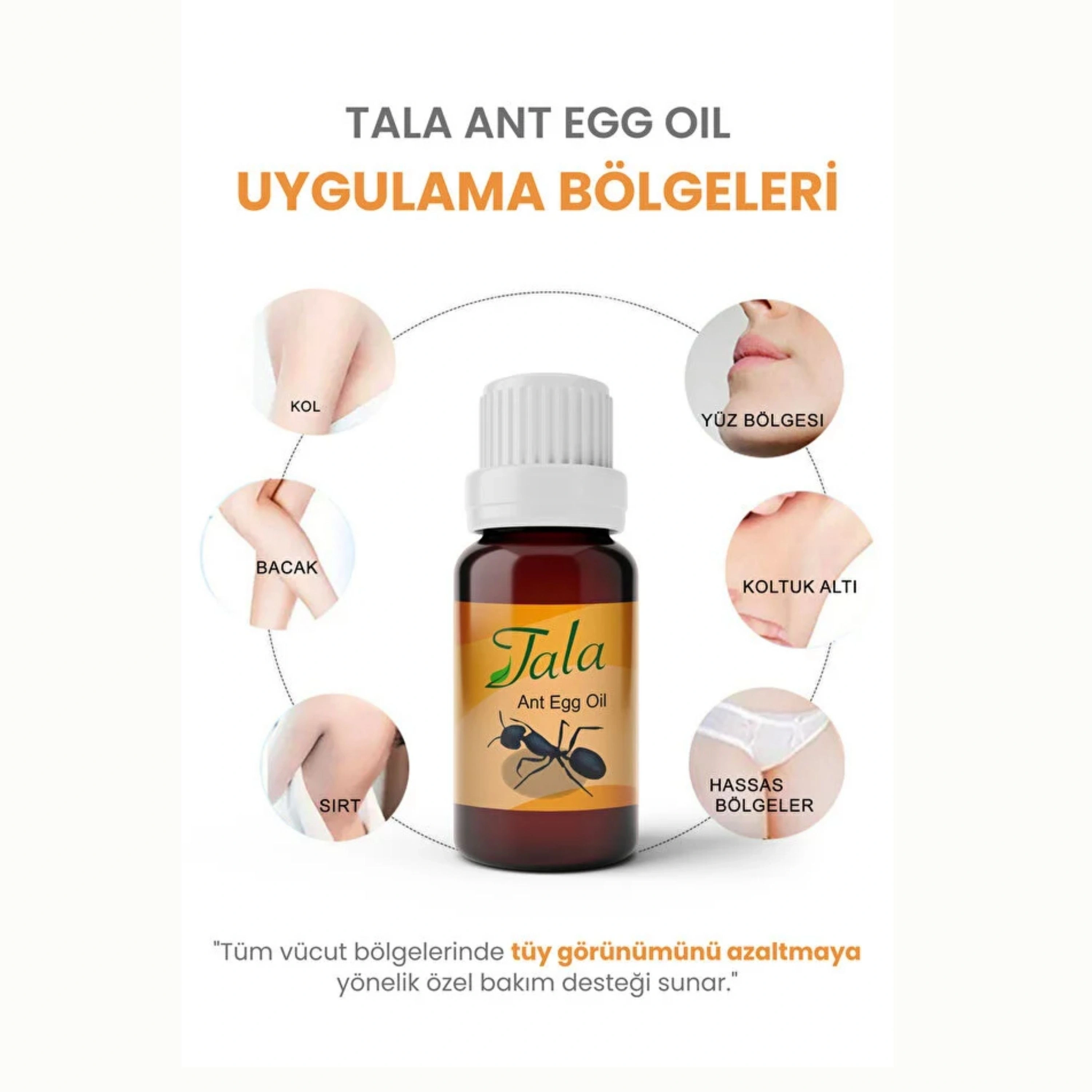 Tala Karınca Yumurtası Yağı, yüzyıllardır Ortadoğu ve Asya kültürlerinde istenmeyen tüylerle mücadelede kullanılan geleneksel bir bakım yöntemidir. Bu özel yağ, tüyleri dökücü bir kimyasal değil, tüyler kökünden alındıktan sonra uygulanan bir bakım ürünüdür. Epilasyon, ağda veya cımbız gibi yöntemlerle tüyler kökünden temizlendiğinde gözenekler açılır. Bu aşamada uygulanan karınca yumurtası yağı, kıl köklerine nüfuz ederek tüylerin zamanla daha ince, daha seyrek ve daha geç çıkmasına yardımcı olmayı hedefler. Cildin pH dengesiyle uyumludur; düzenli kullanımda cilde pürüzsüz bir görünüm kazandırmaya ve cildi nemlendirmeye katkı sağlar.