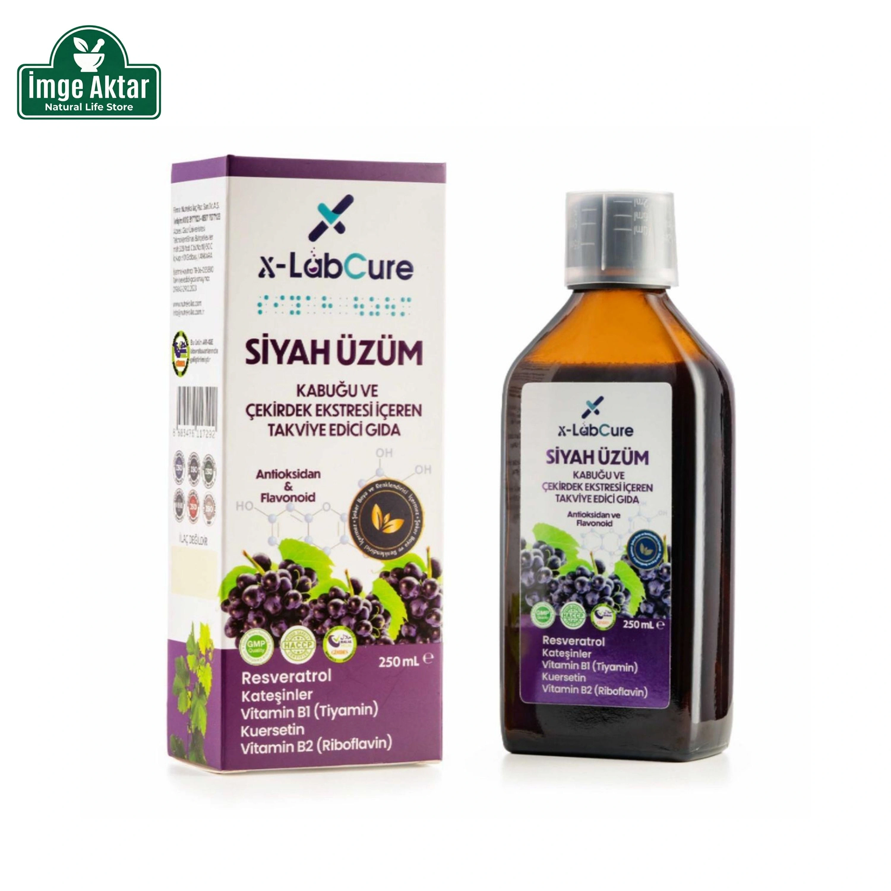 X-Labcure Siyah Üzüm Ekstresi, doğanın en güçlü antioksidan kaynaklarından biri olarak kabul edilen siyah üzümün (Vitis vinifera) sadece meyvesini değil, besin değeri en yüksek olan kabuğunu ve çekirdeğini bir arada işleyerek elde edilen konsantre bir gıda takviyesidir. X-Labcure laboratuvarlarında geliştirilen özel ekstraksiyon yöntemleri sayesinde, üzümün yapısında bulunan ve "gençlik molekülü" olarak da anılan "Resveratrol" maddesi, en saf ve biyoyararlanımı yüksek formuyla şişelenmiştir. Sıvı formu sayesinde tablet veya kapsüllere göre vücut tarafından daha hızlı emilim göstermeyi hedefler. Günümüzün yoğun temposunda, serbest radikallere karşı vücudun savunma mekanizmasını desteklemek ve günlük beslenmeye güçlü bir antioksidan takviyesi eklemek isteyenler için idealdir. Şeker ilavesiz, glütensiz ve vegandır.